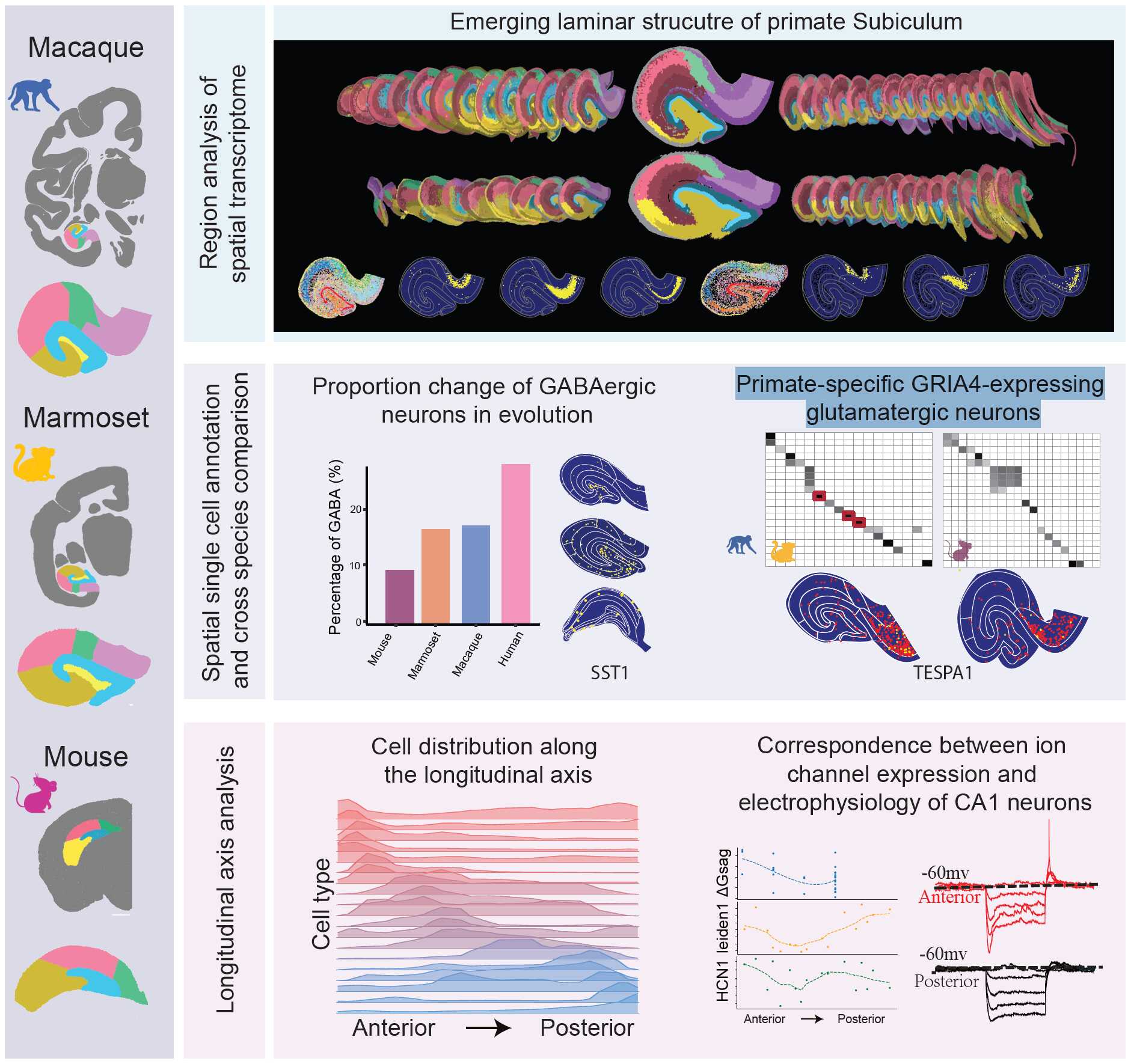 Summary of the cross-species spatial transcriptomic analysis of macaque, marmoset, and mouse hippocampal cells. (Top) Laminar structure of the primate subicular complex. (Middle) Proportional change of GABAergic neurons across species, cell type GABA SST-1 spatially enriched in CA3/CA4, and the identification of primate-specific glutamatergic cell types (e.g., Glu pSUB-int-2 marked by TESPA1). (Bottom) Spatial distributions of glutamatergic cell types along the longitudinal axis analysis, and the correspondence between ion-channel expression (HCN1) and electrophysiology of CA1 neurons.